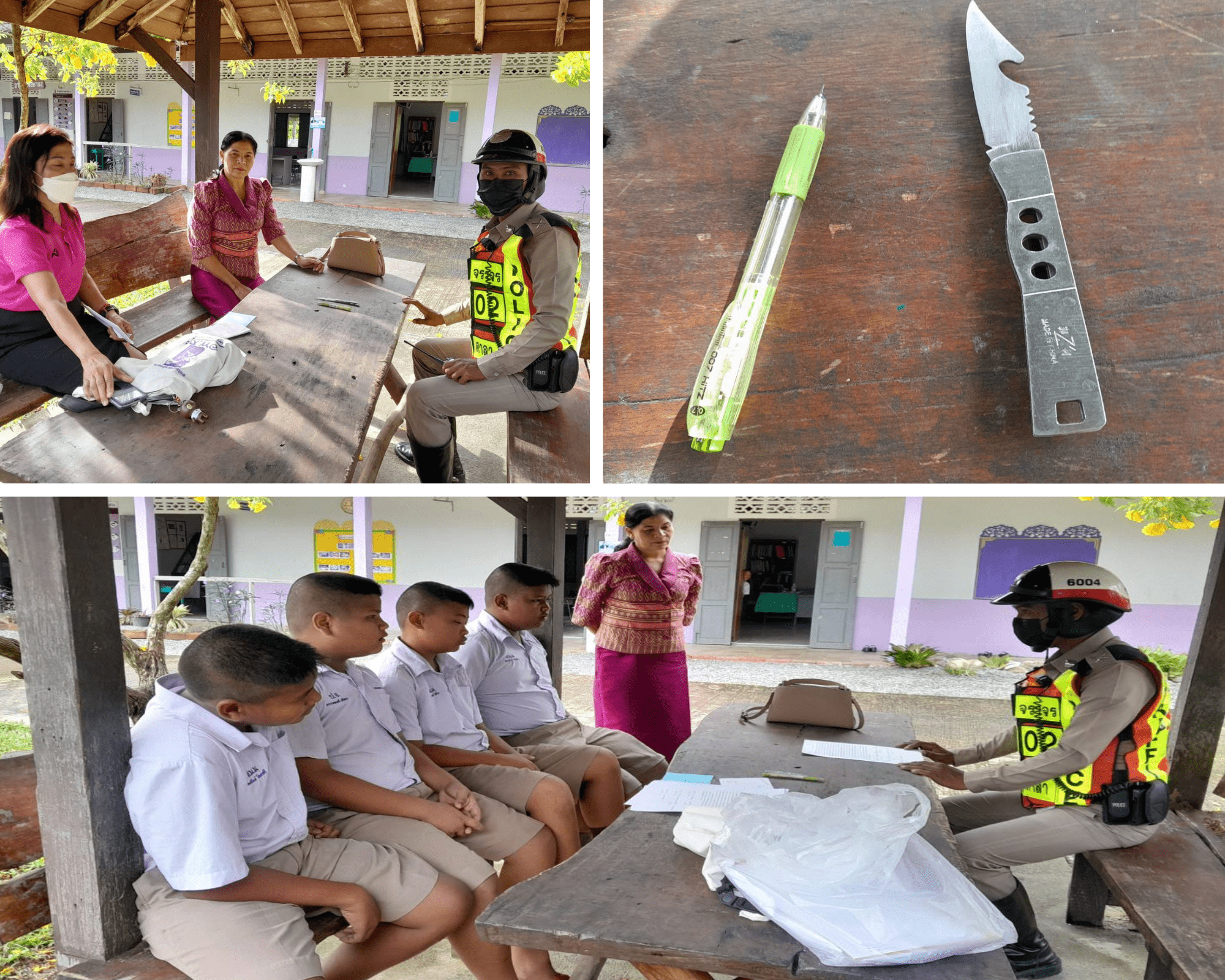 - รายละเอียดวันที่ 10 ม.ค. 2566 เวลา 08.00 น. ด.ต.คมธรรม เพ็งจันทร์ ผบ.หมู่ (จร.)ฯ และ ได้เข้าไปตรวจเยี่ยม รร.บ้านสำนักม่วง ม.6 ต.ท่าขึ้น อ.ท่าศาลา จ.นครศรีธรรมราช เพื่อป้องกันเหตุทะเลาะวิวาทของเด็กนักเรียนภายในโรงเรียนบ้านสำนักม่วงโดยใช้อาวุธมีดและปากกาปลายแหลม ในการปฏิบัติหน้าที่ป้องกันเหตุการณ์ทะเลาะวิวาทดังกล่าว นักเรียนคู่กรณีที่ทะเลาะกันได้ให้ความร่วมมือเป็นอย่างดี
